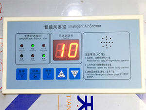 系統采用PLC自動化的控制手段,控制面板上LED顯示屏可正確顯示風淋的運行狀態、雙門的互鎖狀態、風淋周期進度和延時開門狀態,并設有光電感應器,單向通道風淋室,從非潔凈區進入,關門后紅外線感應有人就吹淋,吹淋后入門鎖閉,只能從出門走出風淋室。